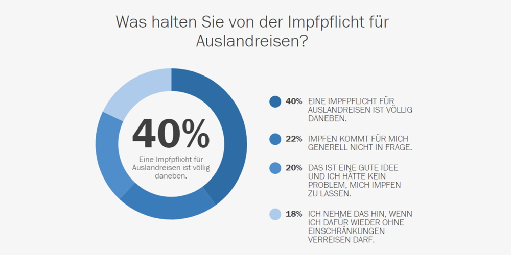 Lediglich ein Fünftel, das sind 111 Teilnehmer, spricht sich für die Impfung aus und findet diese eine gute Idee. Die restlichen 99 Personen (18 Prozent) würden eine solche Impfpflicht hinnehmen, wenn dafür wieder ohne Einschränkungen gereist werden kann. Das Fernweh ist eben grösser als die Sorgen über die Impfung.