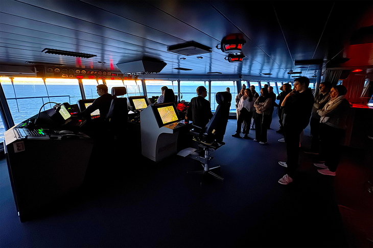 An Bord gewährten Kapitän Pekka Stenvik und Purser Markus Jussila zusammen mit der die Gruppe begleitenden Frauke Werner, Capacity & Yield Manager bei Finnlines, Einblicke in die Reedereistrategie sowie zu Arbeitsabläufen auf der Brücke und zu erfolgreichem Teamwork auf einem technologisch komplexen Hochseeschiff.