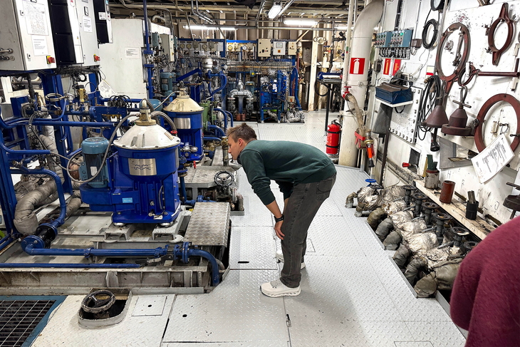 Ein absolutes Highlight und von den Studierenden besonders geschätzt waren die Besuche auf der Brücke und im Maschinenraum unter der Leitung von Kapitän Tobias Magnusson. Dort standen Themen wie Führungsstile, Teamarbeit, Sicherheitskultur und Kommunikation im Zentrum und boten einen authentischen Einblick in das Konzept des Bridge und Crew Resource Managements (BRM/CRM) – ein integratives Führungs- und Managementprinzip, das Hierarchie und Teamarbeit gezielt verbindet, um Sicherheit, Effizienz und Entscheidungsqualität in komplexen, dynamischen Umgebungen zu optimieren.