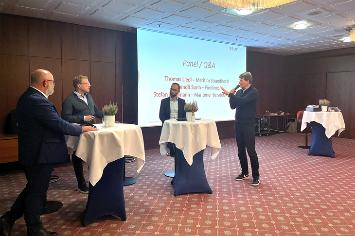 Danach folgte ein erstes spannendes Panel, in dem Hoteldirektor Thomas Liedl, Benoît Surin, Sales, Marketing & Customer Service Manager DACH, Benelux & Poland / Team Leader Passenger Services Germany, Finnlines Deutschland GmbH und «Special Guest» Stefan Krüllmann, Maritime Business Developer und Chair des Nautical Institute Germany, zentrale Fragen rund um Karriere, Leadership, Teamfähigkeit, Resilienz und Persönlichkeitsentwicklung diskutierten – Themen, die für Nachwuchskräfte beider Fachrichtungen eine entscheidende Rolle spielen. Entsprechend viele Fragen kamen auch aus den Reihen der Studierenden.