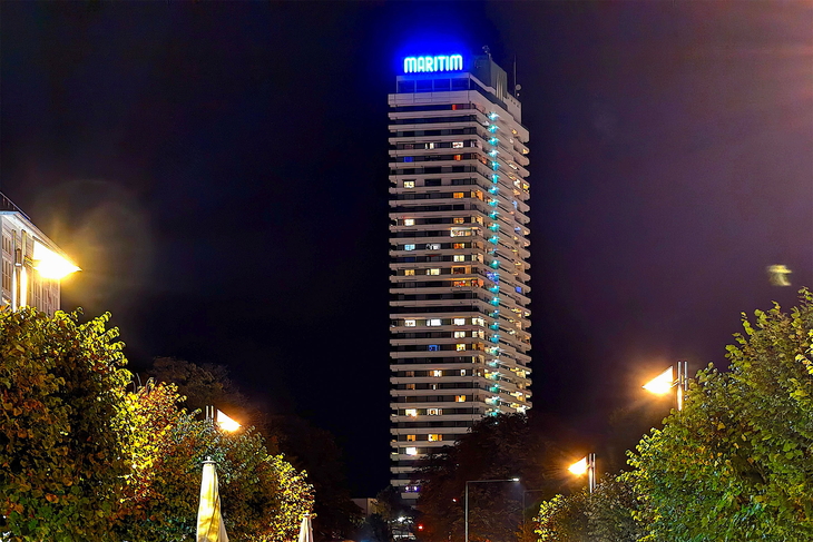 Das markante 36-stöckige Hochhaus weist mit seiner einmaligen Lage mit bestem Blick auf die Lübecker Bucht und den regen Schiffsverkehr in der Mündung der Trave auch gleichzeitig den Schiffen als höchstes Leuchtfeuer Europas den Weg. Mit ihren komfortablen Zimmern, Suiten und Gesellschaftsräumen, hochklassigen Restaurants, grosszügigen Wellnessbereichen und attraktiven Bars gelten die Maritim Hotels als Aushängeschild der deutschen First Class Hotellerie.