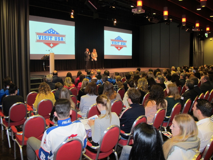 Seit heute Morgen, 9 Uhr ist im Mövenpick Hotel Regensdorf wieder das Visit USA (VUSA) Seminar in Gang. Trotz zuletzt leicht rückläufiger Besucherzahlen von Schweizern in den USA ist das Interesse der Branche am Anlass wie immer sehr gross (siehe Bild unten). Gastland dieses Jahr ist Las Vegas, wohin bekanntlich Edelweiss Air seit Kurzem nonstop ab Zürich fliegt; natürlich sind auch fast alle anderen relevanten US-Marktplayer aus der Schweiz sowie die Repräsentanzen im In- und Ausland mit dabei. Die Agenten können sich freuen: Insgesamt werden heute 20 Flüge in die USA verlost.