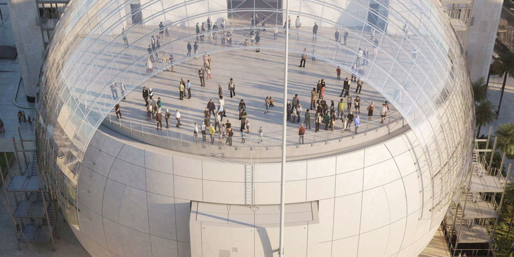 Das mit Spendengeldern in Höhe von 300 Millionen Dollar finanzierte Filmmuseum besteht aus zwei Teilen, die mit Brücken verbunden sind: Einem umgebauten Kaufhaus von 1939 und einem kugelförmigen Gebäude auf Stelzen, von dessen Dach aus der Hollywood-Schriftzug in den Hügeln von Los Angeles zu sehen ist.