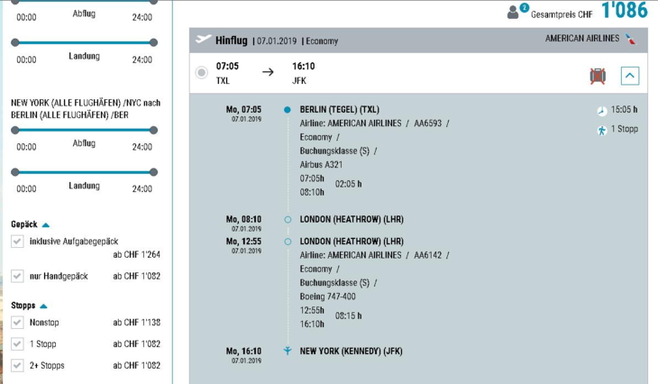 Im Bereich Flug wird auf die Universal API von Galileo zurückgegriffen, und die Lowcost-Airlines sind via Travelfusion angebunden. Damit sind Flüge in allen Varianten buchbar, auch One-Way-Flüge oder Auslandverbindungen ohne Start/Ziel in der Schweiz. Praktisch: Unter einer Preisangabe sind alle Flugoptionen angegeben, d.h. nicht jede Flugoption mit einem möglicherweise identischen Preis, was die Darstellung viel übersichtlicher macht. Darüber hinaus werden sämtliche Flugdetails per Mausklick sofort ersichtlich, was gerade in einem Beratungsgespräch praktisch ist.