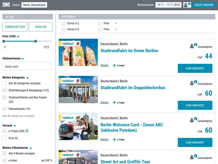 Im Bereich Extras schliesslich sind die Angebote von Getyourguide hinterlegt, angereichert durch Eigenleistungen von Railtour/Frantour, welche hier in die Darstellungslogik von Getyourguide integriert werden, aber mit einem Railtour-Logo erkennbar gemacht werden. Die Zusatzleistungen weltweit können in Kombination mit Flügen oder Hotels oder auch allein gebucht werden.