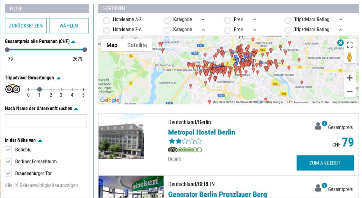 Im Bereich «Hotels» kann man auf Content von sechs Bettenbanken (darunter Hotelbeds und Expedia) zurückgreifen, insgesamt rund 150'000 Hotels, wobei in der Darstellung die Hotels, welche einen Direktvertrag mit Railtour-Frantour haben, priorisiert werden. Ansonsten erfolgt die Darstellung, nachdem gefiltert wurde, wie üblich absteigend nach Preis. Praktisch: Die Hotels sind mit Googlemaps verknüpft, so dass die Position jedes Hotels auf einer Karte präzis angezeigt werden kann. Nebst üblichen Filterfunktionen wie der Sterne-Kategorie gibt es bereits eine geografische Filterfunktion, welche auf die jeweilige Stadt abgestimmt ist, d.h. man kann in Berlin zum Beispiel nach «Brandenburger Tor», «Hauptbahnhof», «Fernsehturm» oder «Nähe Flughafen» vorfiltern.