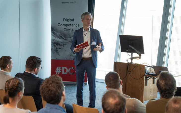 Roger Altorfer von Microsoft hiess die Teilnehmenden als Gastgeber willkommen. Das Technologieunternehmen arbeitet seit acht Jahren eng mit discover.swiss zusammen und stellte den Raum bereits zum vierten Mal für den DCC zur Verfügung. Durch das Programm führte Jon Erni, Präsident der Genossenschaft discover.swiss.