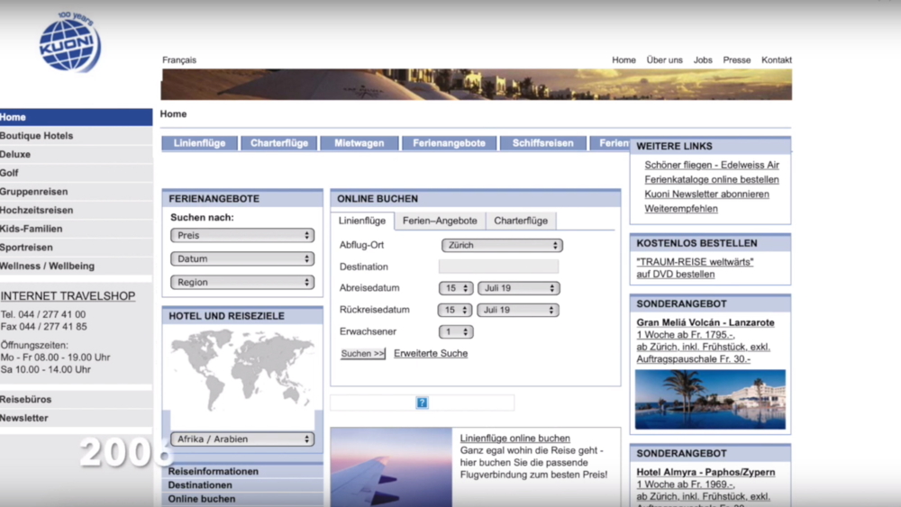 Wir schreiben das Jahr 1996. Das Reiseunternehmen Kuoni hat eben das Internet entdeckt und beginnt erste wacklige Gehversuche online. Noch statisch und unbeholfen ist der Auftritt.