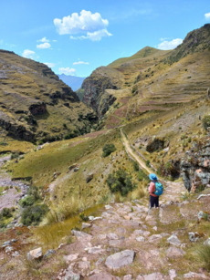 Vom anfänglichen Paramogras wird es etwas grüner und die Vegetation abwechslungsreicher. Zu dieser Jahreszeit gibt es viele Blumen hier oben. Dann kommen wir zunächst an ein verlassenes Dorf, der Weg wird schmaler und schon gehen wir eine enge Schlucht entlang, Wasser strömt neben uns den Berg hinunter. Es ist traumhaft. Noch ein paar Biegungen weiter und wir haben den Blick auf die Ruinenanlage Huchuycosco. Auch hier kein Mensch.