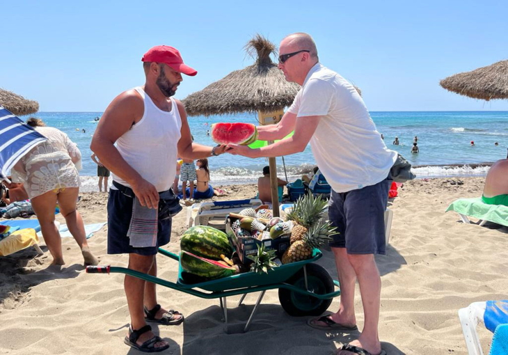 Strandverkäufer Jacobo freut sich wieder über gute Umsätze – Travelnews-Strandreporter Gregor Waser greift genüsslich zu.