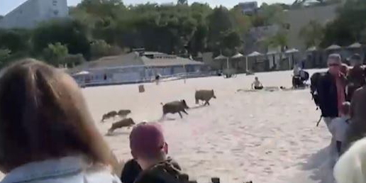 In der polnischen Küstenstadt Gdynia spielten sich turbulente Szenen ab. Mehrere Wildschweine tummelten sich dort an einem Sandstrand. Als sich ein Mann in einem blauen Shirt von hinten einem Jungtier näherte, ging plötzlich alles ganz schnell. Aufgescheucht von der anscheinend unliebsamen Annäherung setzt sich die Rotte blitzschnell in Bewegung und sucht das Weite. Ein kurzes Video dokumentiert die Szenerie. Schon nach wenigen Sekunden waren die Schweine wieder weg. Auch wenn die Tiere ohne Rücksicht auf Verluste losstürmten, kamen keine Menschen zu Schaden. Dem ein oder anderen Badegast dürfte das Herz allerdings kurz in die Hose gerutscht sein. (Gelesen auf «20min.ch»)