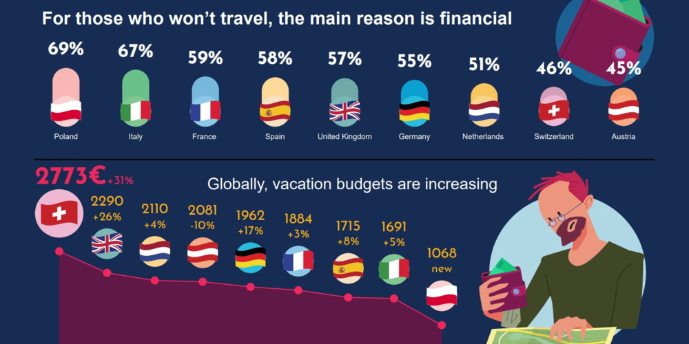 Verglichen mit 2022 hat sich noch ein weiterer Wert stark verändert. Trotz des anhaltenden Drucks auf die Lebenshaltungskosten und der hartnäckig hohen Inflation: Das Reisebudget in der Schweiz hat sich um über 500 Franken erhöht, auf durchschnittlich gut 2700 Franken. Auf der anderen Seite der Statistik steht Österreich, wo das Reisebudget sogar verringert wurde. Einen Rückgang gab es sonst in keinem der untersuchten Länder.