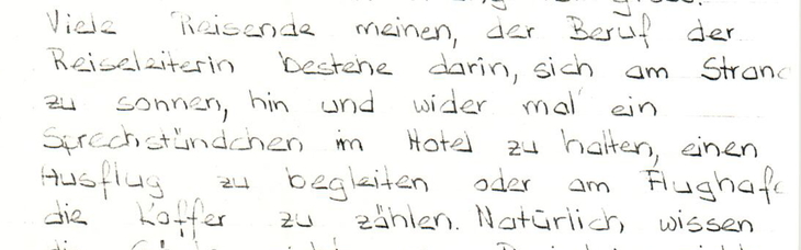 Viele Reisende meinen, der Beruf Reiseleiterin bestehe darin, sich am Strand zu sonnen, hin und wieder mal ein Sprechstündchen im Hotel zu halten, einen Ausflug zu begleiten oder am Flughafen die Koffer zu zählen. Natürlich wissen die Gäste nichts vom Papierkrieg, nichts von Transferlisten, Ausflugslisten, Hotellisten, nichts von Busbestellungen, Ticketänderungen und den vielen mühseligen Kleinarbeiten.