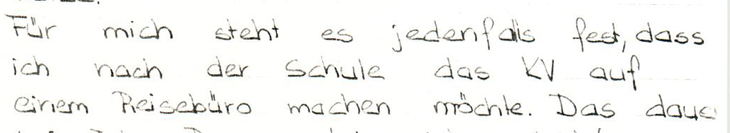 Für mich steht es jedenfalls fest, dass ich nach der Schule das KV auf einem Reisebüro machen möchte. Das dauert drei Jahre. Dann verbringe ich vielleicht einige Zeit im Ausland, um die Sprachen besser zu erlernen. Nachher will ich versuchen, ob ich mich überhaupt als Reiseleiterin eigne.