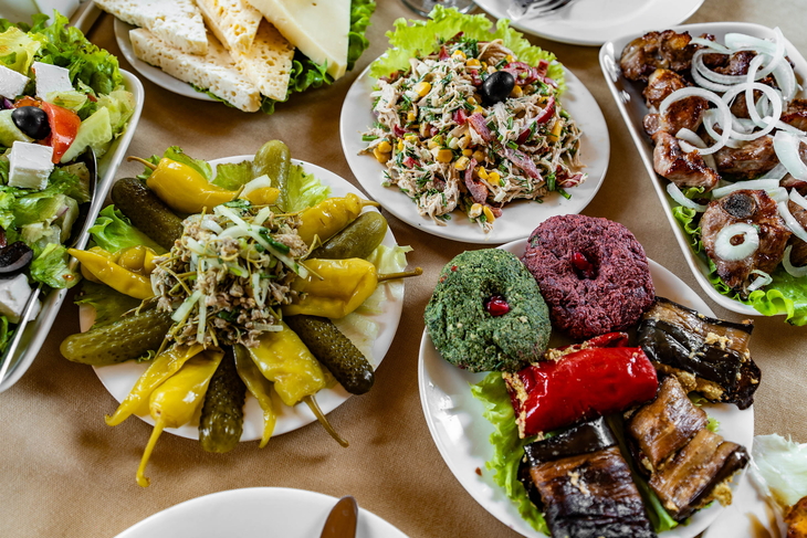 Bereits in Tiflis ist die Auswahl an fantastischen Restaurants gross. Hier werden stets verschiedene Speisen zum Teilen auf den Tisch gestellt. Immer mit dabei: ein Salat bestehend aus Tomaten und Gurken, Brot, Käse und Fleisch.