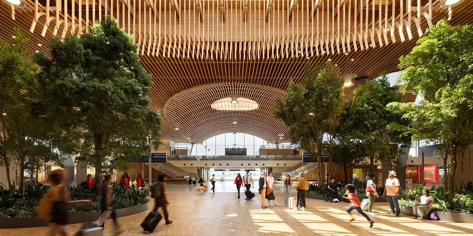Ganz auf Nachhaltigkeit setzt man in der US-Stadt Portland: Ein 36'000 Quadratmeter grosses Holzdach prägt das Terminal – die Hölzer stammen aus einem Umkreis von 500 Kilometern. Der Flughafen will sich wie ein Waldspaziergang anfühlen – und trifft mit dieser Idee den Zeitgeist.